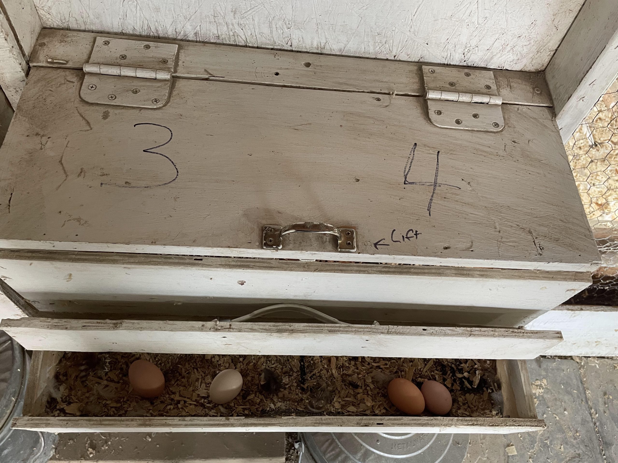 Our nests are built into the coop’s wall, so we can open a hinged door and collect eggs without entering the coop. It’s convenient. We’ve also made two “roll out” nests.